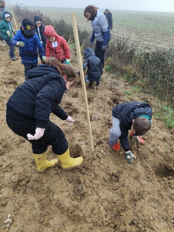 L’après-midi, les élèves de CE2, CM1 et CM2 ont pris le relais sur le site du Vallon de la Charbonnière. Eux aussi ont mis la main à la terre pour contribuer à cette plantation, découvrant concrètement l’importance des haies bocagères pour la biodiversité et le paysage local.