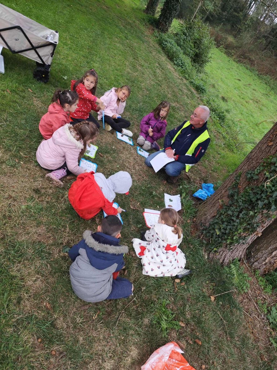Nous avons commencé par un temps d’observation de la nature, pour remarquer les changements qu’apporte l’automne: les feuilles humides, les couleurs qui évoluent, les sons des arbres. Après un petit exercice pour réveiller notre corps, nous nous sommes lancés dans des activités scolaires, en pleine nature.
