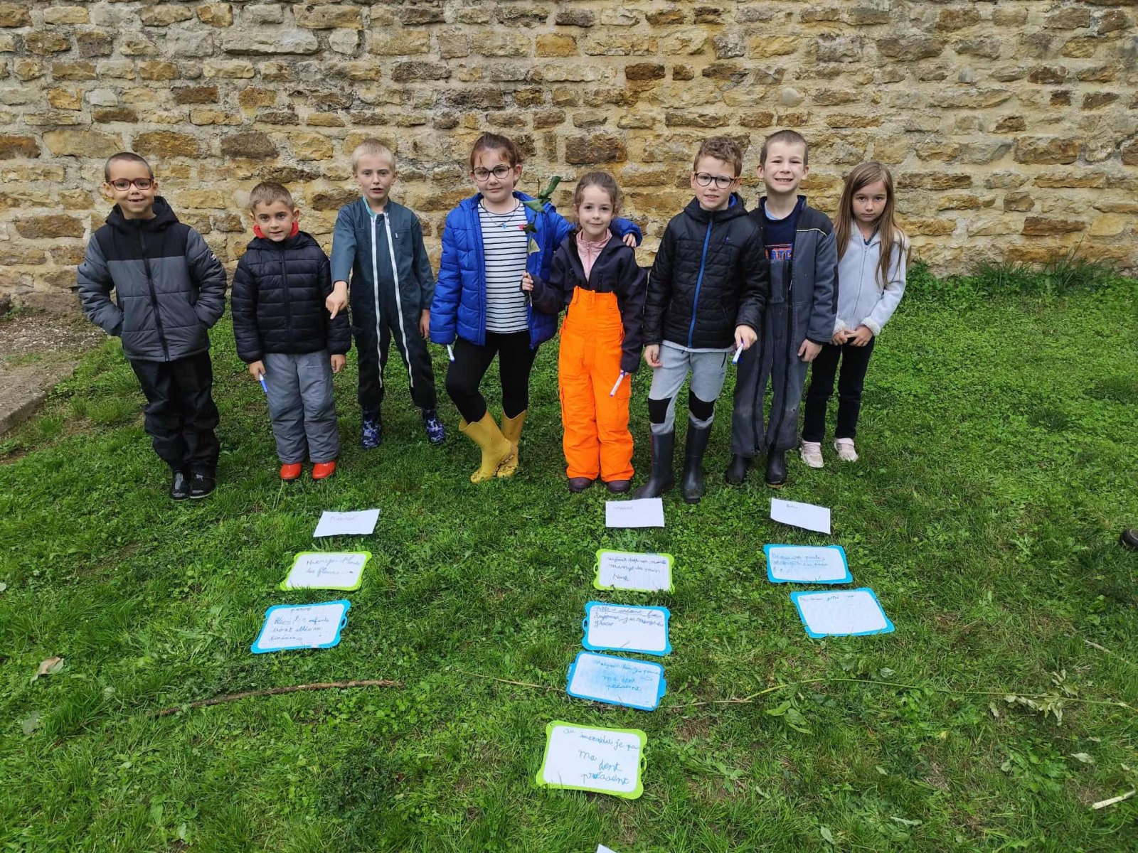 Les CE1, accompagnés par Alain, ont remis des mots dans l’ordre alphabétique puis écrit des phrases à partir de leur liste de mots. Ils ont ensuite classé leurs phrases au passé, au présent ou au futur. Pour cela, ils ont construit une belle frise du temps avec des éléments de la nature.